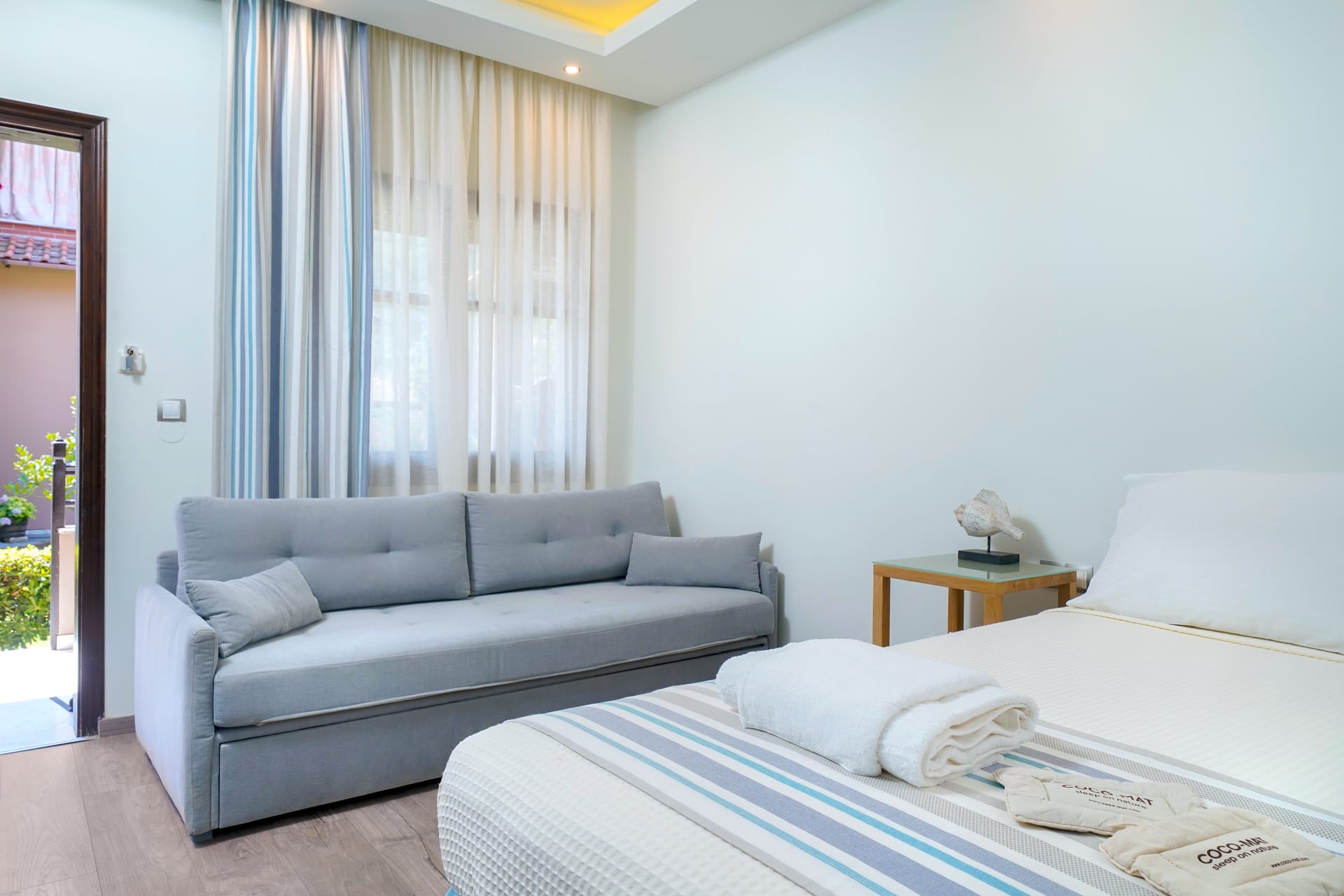Deluxe Rooms with Garden View are 28m² and can accommodate up to 3 people. All rooms are located in the Semeli building and offer views of the garden. Two are located on the mezzanine floor, two on the ground floor, and one on the first floor.